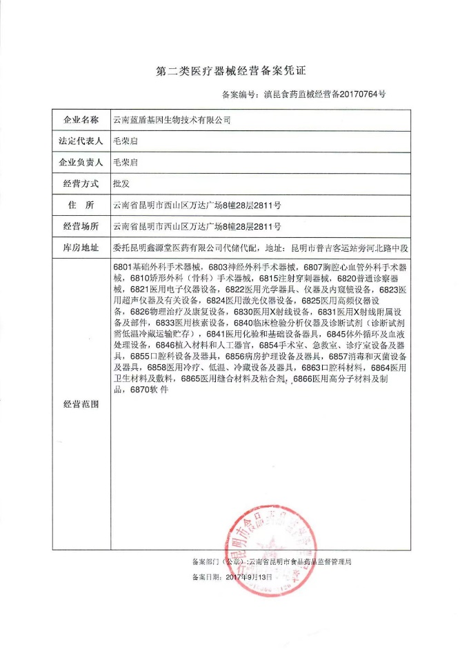 2017年9月12日,蓝盾基因生物技术有限公司公司获昆明市市场监督管理局颁发《医疗器械经营许可证》和《第二类医疗器械经营备案证》。其批准三类经营许可范围:6815注射穿刺器械,6823医用超声仪器及有关设备,6824医用激光仪器设备,6825医用高频仪器设备,6826物理治疗及康复设备,6828医用磁共振设备,6830医用X射线设备,6832医用高能射线设备,6833医用核素设备,6840临床检验分析仪器及诊断试剂(诊断试剂需低温冷藏运输贮存),6845手术室、急救室、诊疗室设备及器具,6858医用冷疗、低温、冷藏设备及器具,6863口腔科材料,6866医用高分子材料及制品,6870软件;二类备案经营范围:6801基础外科手术器械,6803神经外科手术器械,6807胸腔心血管外科手术器械,6810矫形外科(骨科)手术器械,6815注射穿刺器械,6820普通诊察器械,6821医用电子仪器设备,6822医用光学器具、仪器及内窥镜设备,6823医用超声仪器及有关设备,6824医用激光仪器设备,6825医用高频仪器设备,6826物理治疗及康复设备,6830医用X射线设备,6831医用X射线附属设备及部件,6833医用核素设备,6840临床检验分析仪器及诊断试剂(诊断试剂需低温冷藏运输贮存),6841医用化验和基础设备器具,6845体外循环及血液处理设备,6846植入材料和人工器官,6854手术室、急救室、诊疗室设备及器具,6855口腔科设备及器具,6856病房护理设备及器具,6857消毒和灭菌设备及器具,6858医用冷疗、低温、冷藏设备及器具,6863口腔科材料,6864医用卫生材料及敷料,6865医用缝合材料及粘合剂,6866医用高分子材料及制品,6870软件。基本覆盖医疗器械、试剂耗材经营全部类别。