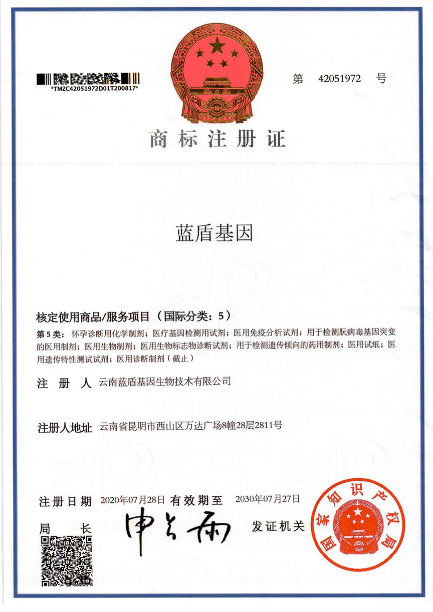 2020年7月,蓝盾基因生物技术有限公司“蓝盾基因”商标获国家知识产权局核定使用商品/服务项目(国际分类:5)成功注册。商标注册第5类包含内容为怀孕诊断用化学制剂、医疗基因检测用试剂、医用免疫分析试剂、用于检测朊病毒基因突变的医用制剂、医用生物制剂、医用生物标志物诊断试剂、用于检测遗传倾向的药用制剂、医用试纸、医用遗传特性测试试剂、医用诊断试剂。