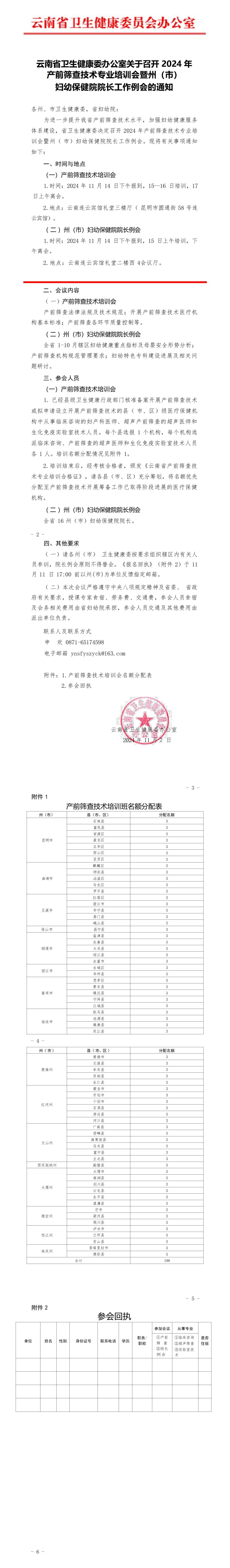 云南省卫生健康委办公室关于召开 2024 年产前筛查技术专业培训会暨州(市)妇幼保健院院长工作例会的通知