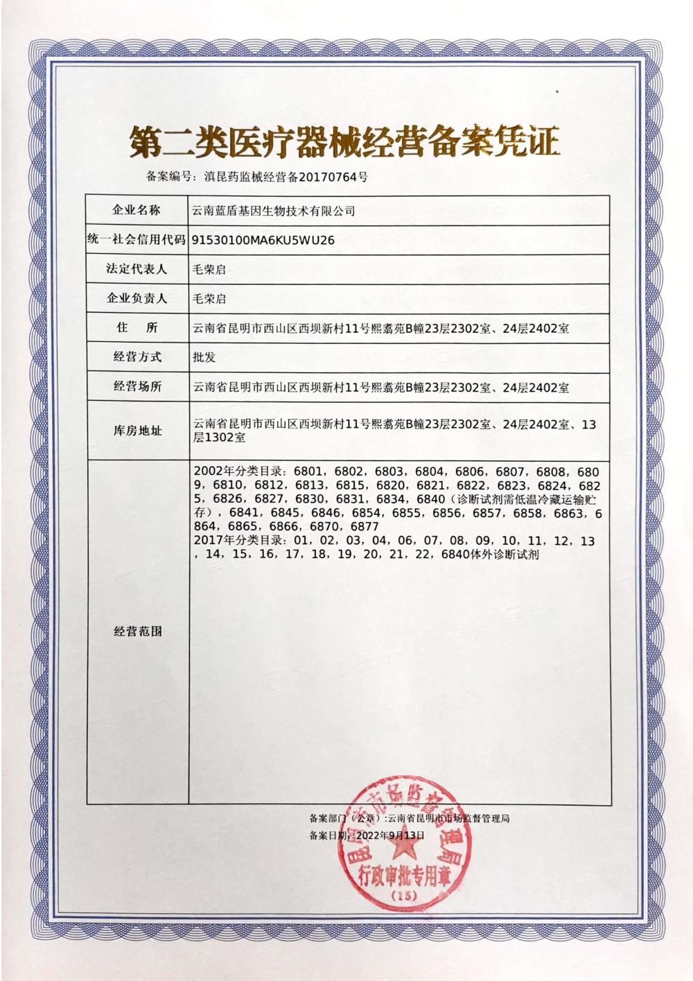 【蓝盾基因】商标注册证(5类)