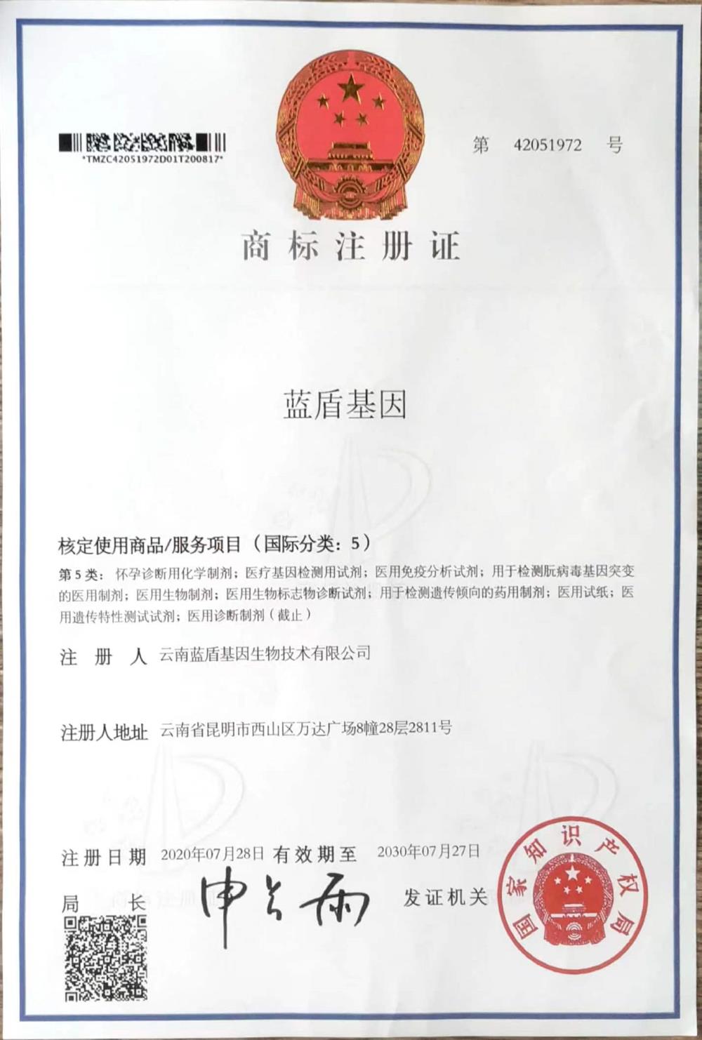 【蓝盾基因】商标注册证(5类)